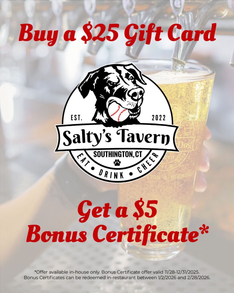 We’re so excited to announce that we teamed up with Bread for Life to support our local community. ❤️ For every 3 non-perishable donations you bring to Salty’s Tavern in Southington, you’ll receive a $5 OFF coupon towards your next visit.